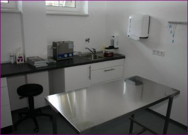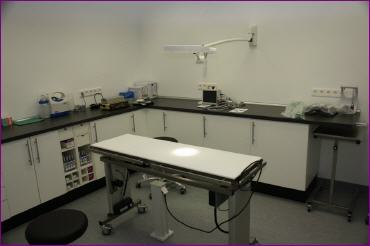 Hier führen wir die sterilen Operationen durch. Dabei findet durch uns eine kontinuierliche apperative Überwachung der Vitalfunktionen statt. Zur Narkose benutzen wir eine Inhalationseinheit, die eine genaue Dosierung der Narkosetiefe - individuell angepasst für den jeweiligen Patienten - möglich macht. Für spezielle oder aber stark blutende Operationen steht uns hier auch die Elektrochirurgie zur Verfügung.