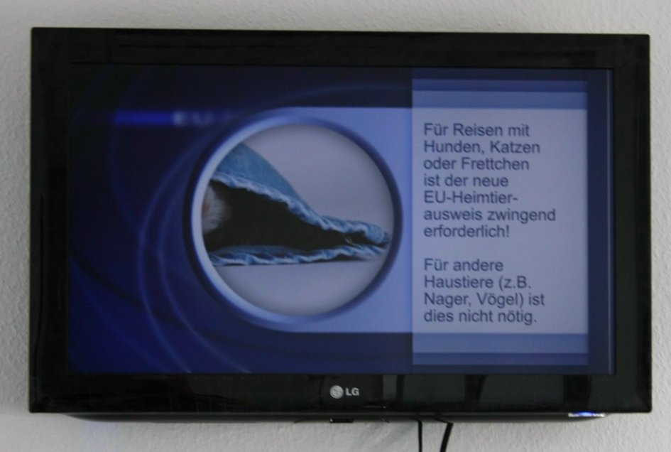 In unserem Wartebereich informieren wir Sie mit aktuellen Präsentationen über Tiere, ihre Krankheiten und Beschwerden und was dagegen getan werden kann - sei es durch moderne Tiermedizin und -pharmazie oder aber auch durch artgerechte und gesunde Ernährung Ihrer Lieblinge.